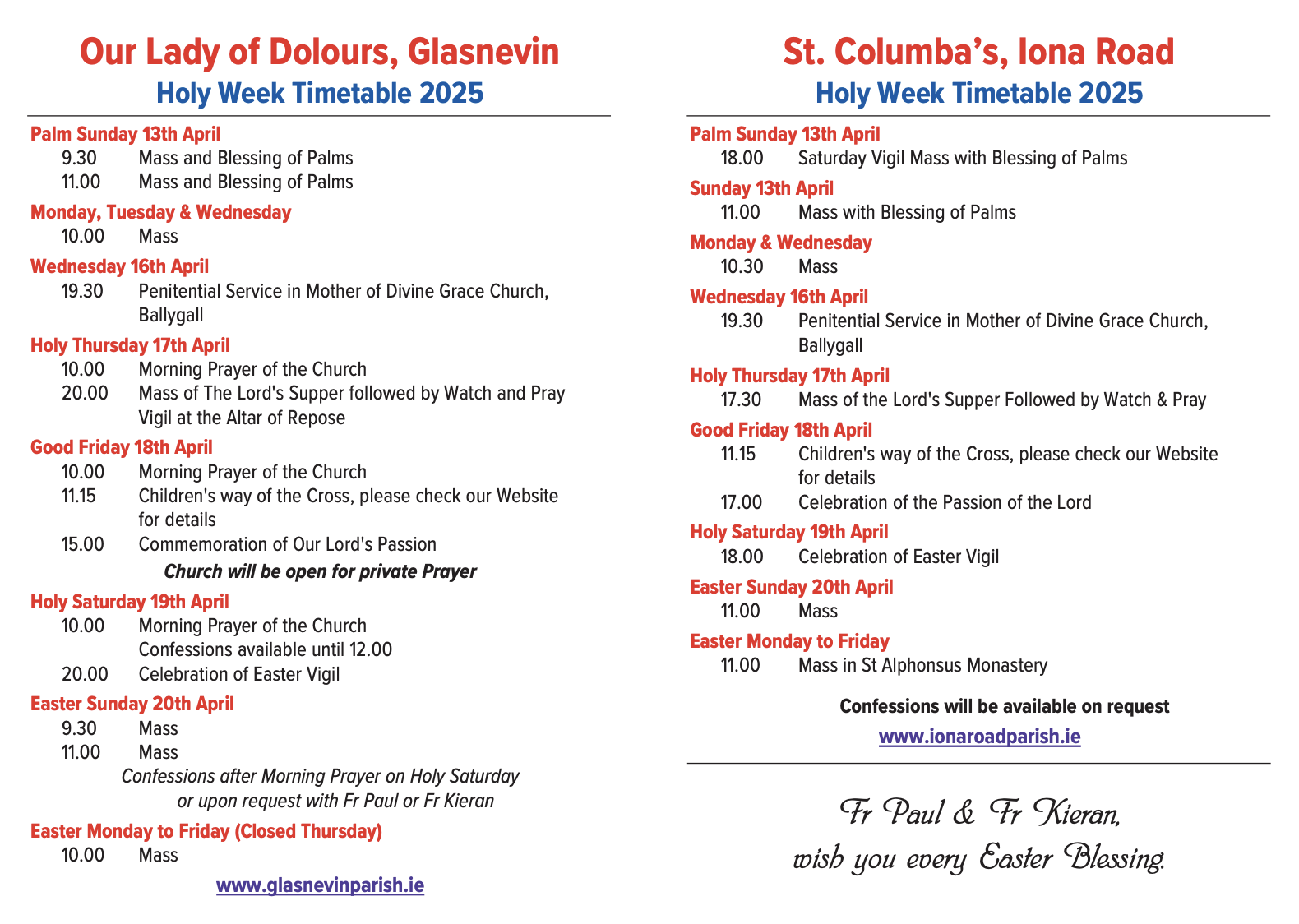 Welcome to the website of the parish of St Columba, Iona Road, Dublin. The parish of St. Columba, Iona Road is part of the Glasnevin Grouping of Parishes with the parishes of : Our Lady of Dolours, Glasnevin, Corpus Christi, Drumcondra, Our Mother of Divine Grace, Ballygall Road East, Our Lady of Victories, Ballymun Road, in the Archdiocese of Dublin.