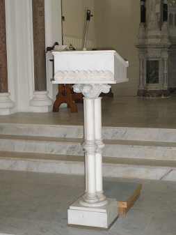 The Pulpit is just outside the altar rails, made of white marble and depicting the life of St. Columba. Of particular interest is the carving of the Saint and his Monks ailing to the island of Iona. You will also see St. Columba preaching the Gospels. Let us pray, through the intercession of St. Columba, for our parish, that the Lord will help us to listen to His Word, to put it into practise and to be more attentive to the reading of the Gospel.